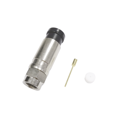 Conector F Macho de Compresión Axial con Borne Negro para instalar en Cable Coaxial RG-11, 75 Ohm, Bronce-Niquelado.